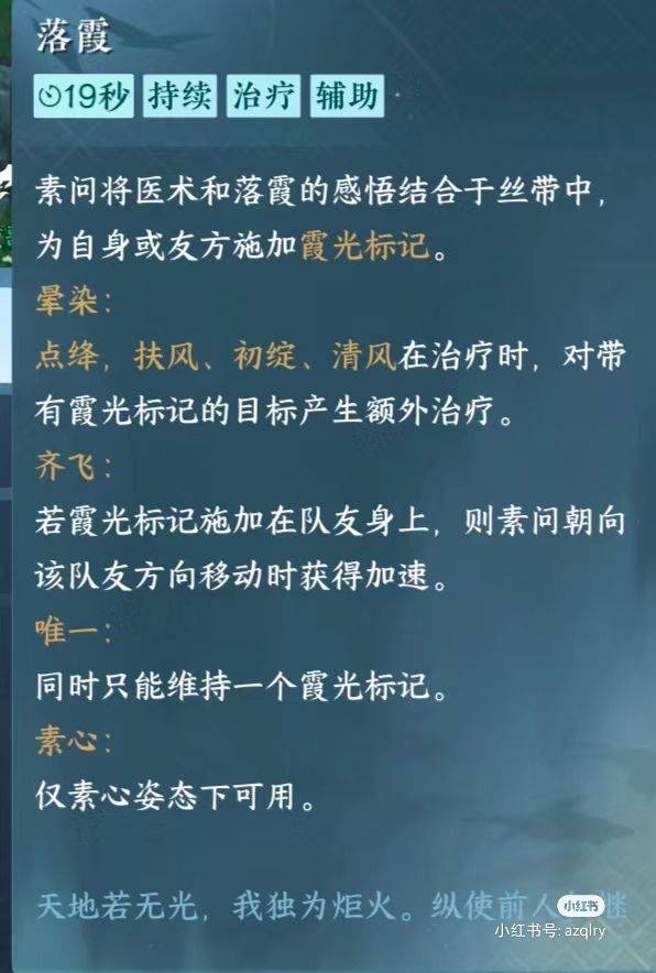🌼落霞这个技能一般是单奶某个人的时候用,释放技能时最好第一个释放落霞,这样我们释放其他部分技能时可以产生额外治疗,具体解释看图二。