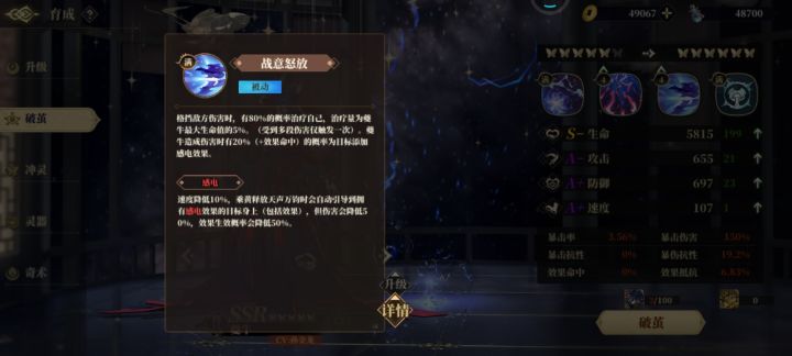 关于效果命中,如果搭配乘黄走感电晕眩流,则夔牛至少需要堆40效命,乘黄命中越高越好。如果是pvp,在没有高蝶一速蚩离的情况下,用满蝶一速乘黄抢先手也是一个不错的选择。