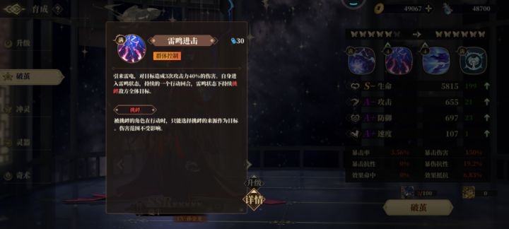 大招效果:开启“雷鸣”姿态(相当于自身先机结界),在状态持续期间。敌人每次行动都会被判定一次来自夔牛的“挑衅”。“挑衅”命中,则敌人的单体技能仅能对夔牛造成伤害(aoe技能须标记夔牛施放,但不影响aoe伤害的触发)