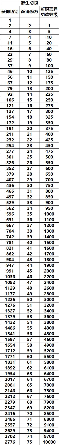 游戏玩法很简单。1、放生动物积攒功德,提升功德等级后解锁新的动物,提升放生效率和获得修为。2、通过“每日福利”+“自动放生(70次/天)”积累,提升自动放生速度,加速过程1。3、获得修为后,通过“成神之路”里的“降妖伏魔”,提高自动放生加成,并提高境界。4、境界达到“创世神”后,解锁“创世之源”,进行“飞升上界”(大转)获得创世币,以获得自动放生的加成。
