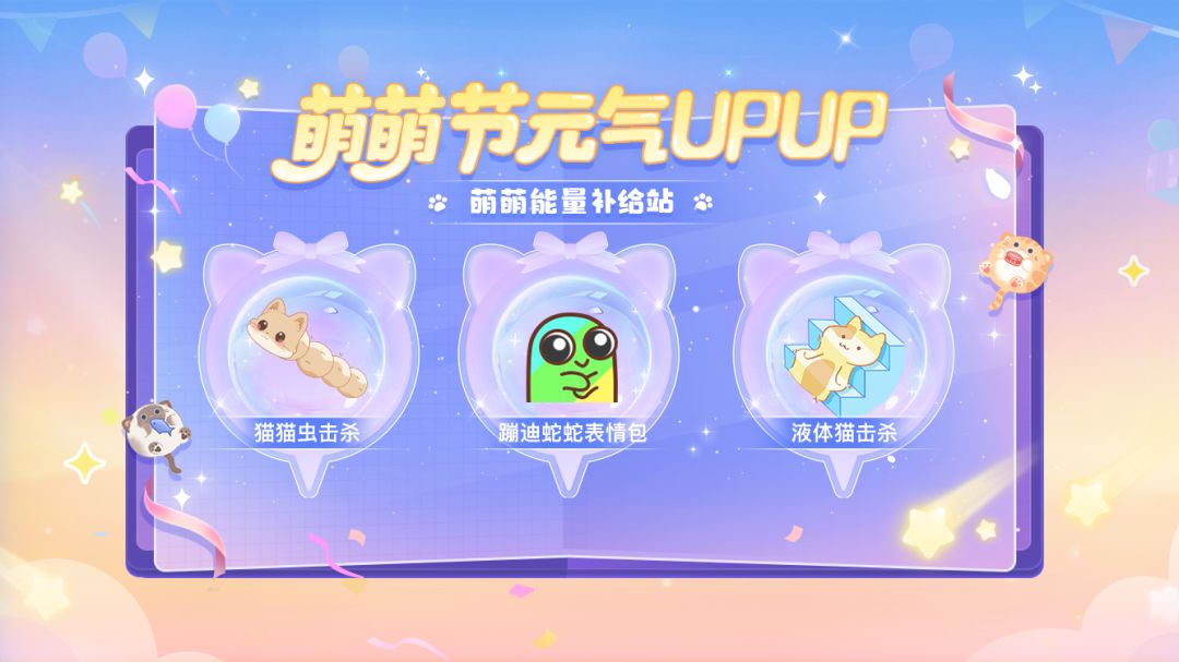 10月12日开始,完成【萌萌节元气upup!】中的活跃任务,就可以领取敲萌永久击杀【猫猫虫】【液体猫】和【蹦迪蛇蛇】表情包。猫猫虫谐音毛毛虫,蹦迪蛇蛇跳着《江南style》,设计的小巧思,为你补充可爱能量~biu~