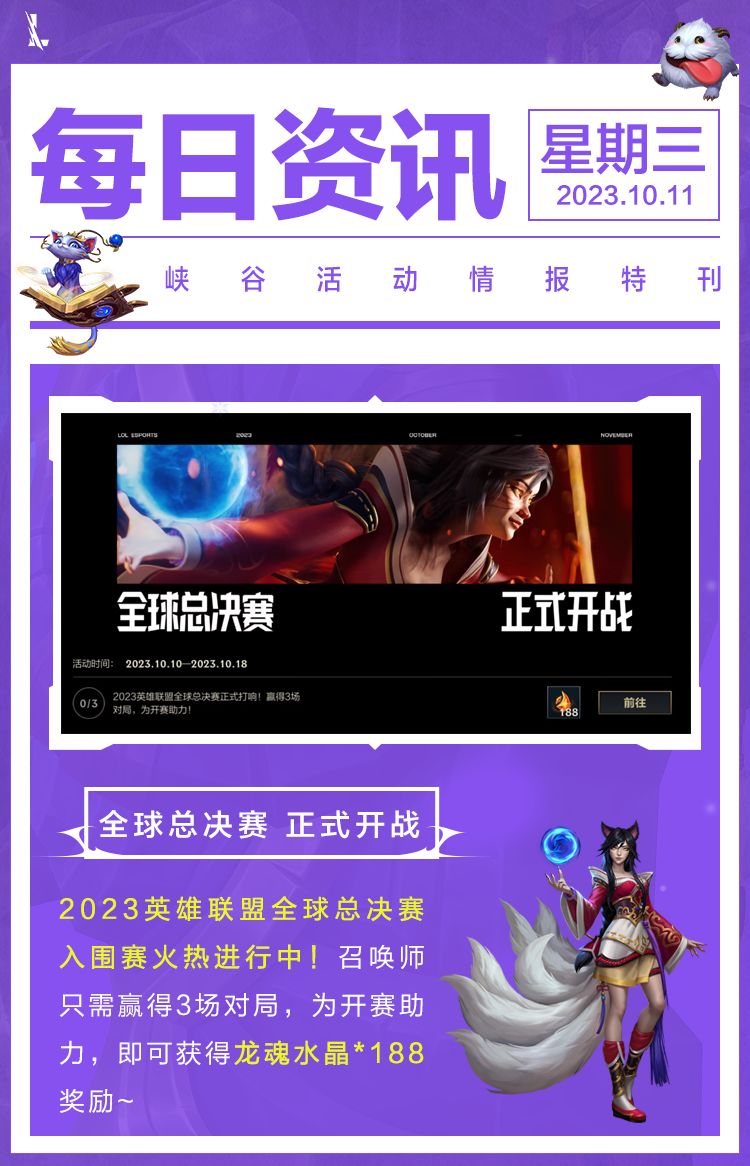 4.3d版本将会在10月12日(明日)更新,在那之前,不要忘记领取游戏内的福利哦!“星之守护者”和“峡谷郊游 轻松一刻”活动将于今晚结束,召唤师记得及时领取龙魂水晶和星之守护者个性化道具。