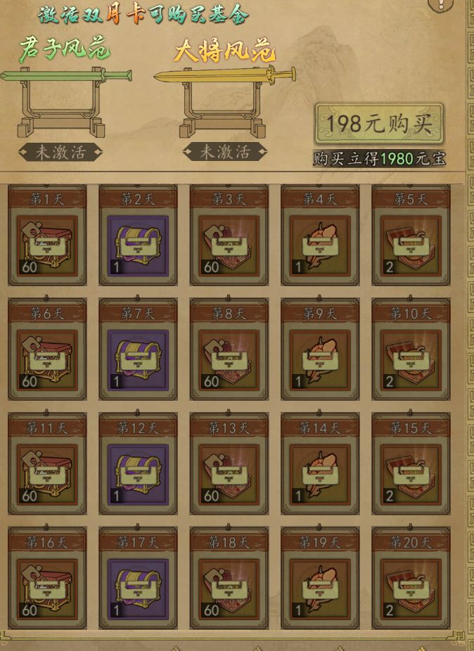 活动里的各类投资,建议对元宝有需求的玩家必买。性价比:五星。这里需要特殊提的是,购买双月卡激活的道具投资。也是性价比最高的投资。包涵,武将碎片,宝石,宝物碎片,升星石,将魂。满足一切硬实力的提升。毫不夸张的说,买月卡就是为了这个道具投资,必买!