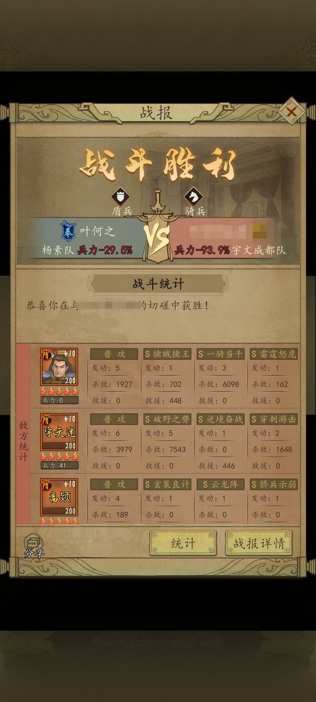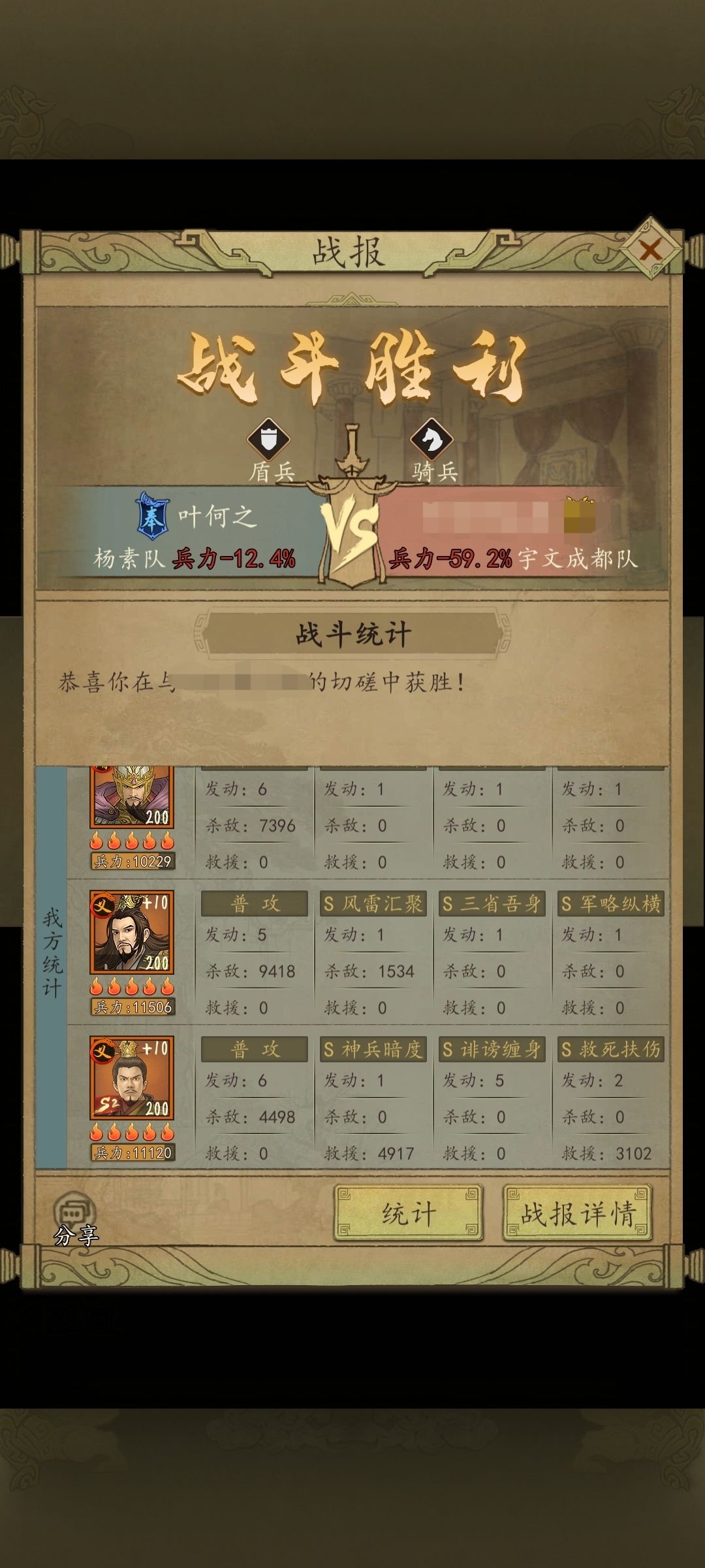 。 第二套阵容则是由于S2科技没起来,而且没有了1.5整合赛季后宝物不足导致单阴阳本身减伤及其有限不能稳定战胜甚至低配置下对爆头骑输多胜少,只能让杨素带上阴阳偃月来保护李淳风不被集火抬走,但是就牺牲了杨素的减伤,带嘲讽和李世民又不稳定,还是会被爆头骑爆发秒掉,所以选择了尝试使用李轨搭配偃月阴阳,给杨素3-5回合稳定五十增伤与治疗副将稳定九十左右的减伤从而逆克制战胜爆头骑下面也放了战报战法可以自己调整,算是对李轨进行了一次再就业