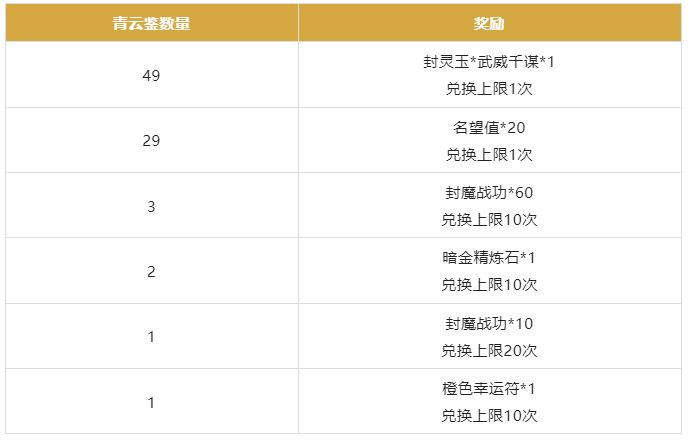 完成指定活动得青云鉴,即可兑换封灵玉*武威千谋、名望值、封魔战功等道具!