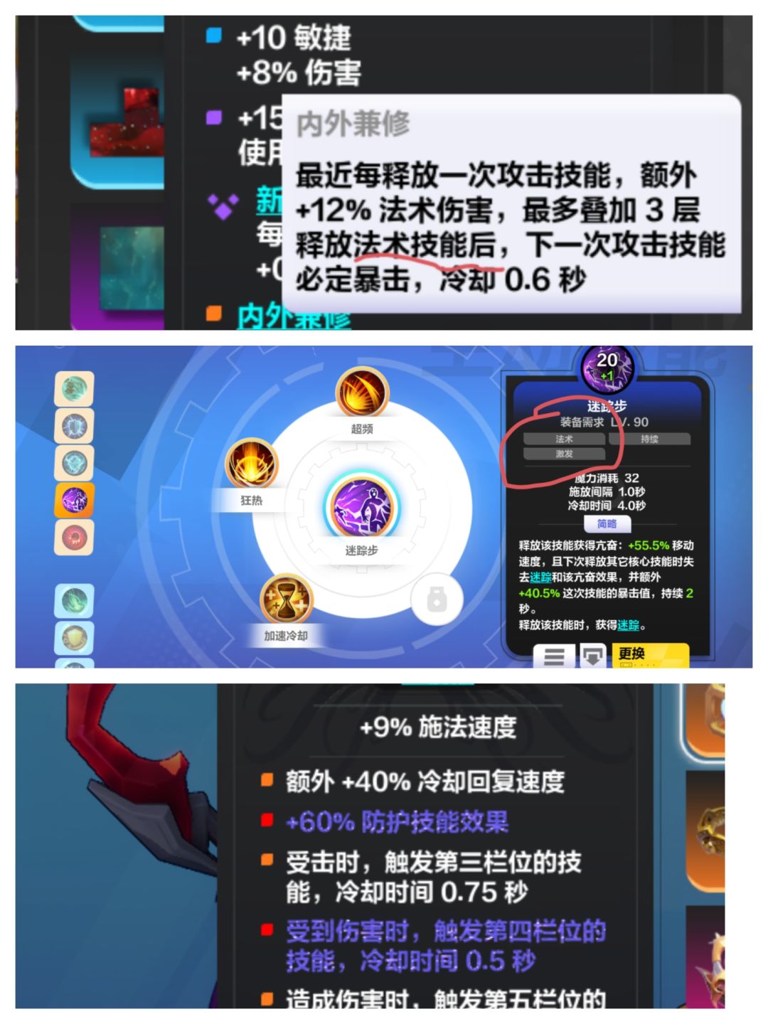 内外兼修法术技能0.6s必定暴击,防护墨盒一直触发迷踪步。