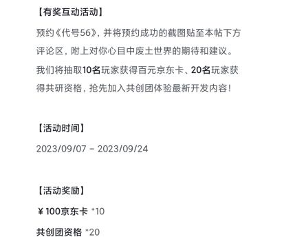 事情是这样的,9月份的时候,56官方在Tap发布了一个活动,帖子是“《代号56》百万预约达成,诚邀共创东方废土世界!”,互动内容很简单,要求玩家晒出预约截图或者填写问卷即可。奖品是100块的d卡和创团资格,就参加了。