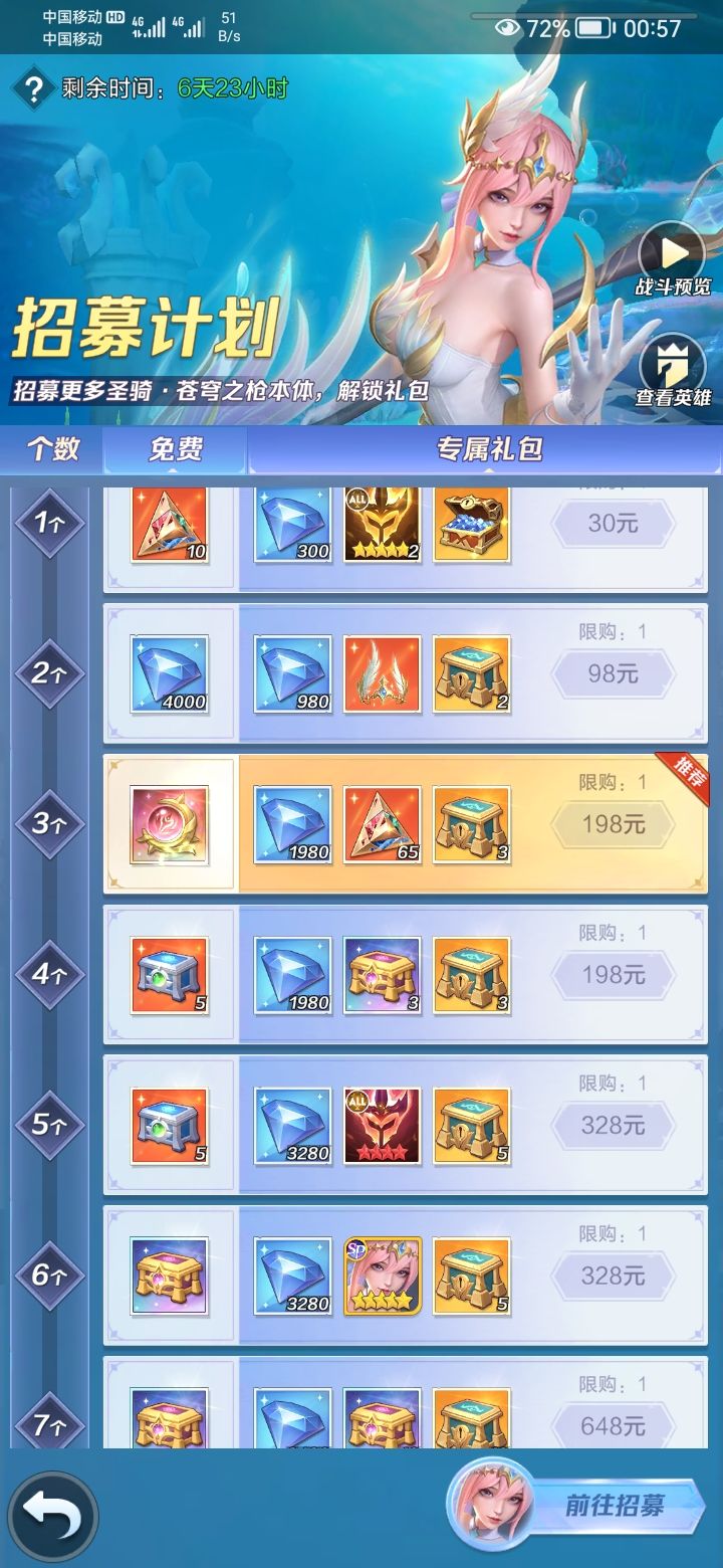 6,零氪玩家花钻2400×4=9600钻,获得40次招募+10次免费=50次招募,是最划算的。可以在商店免费换取50的箱子,获得3个雕文。