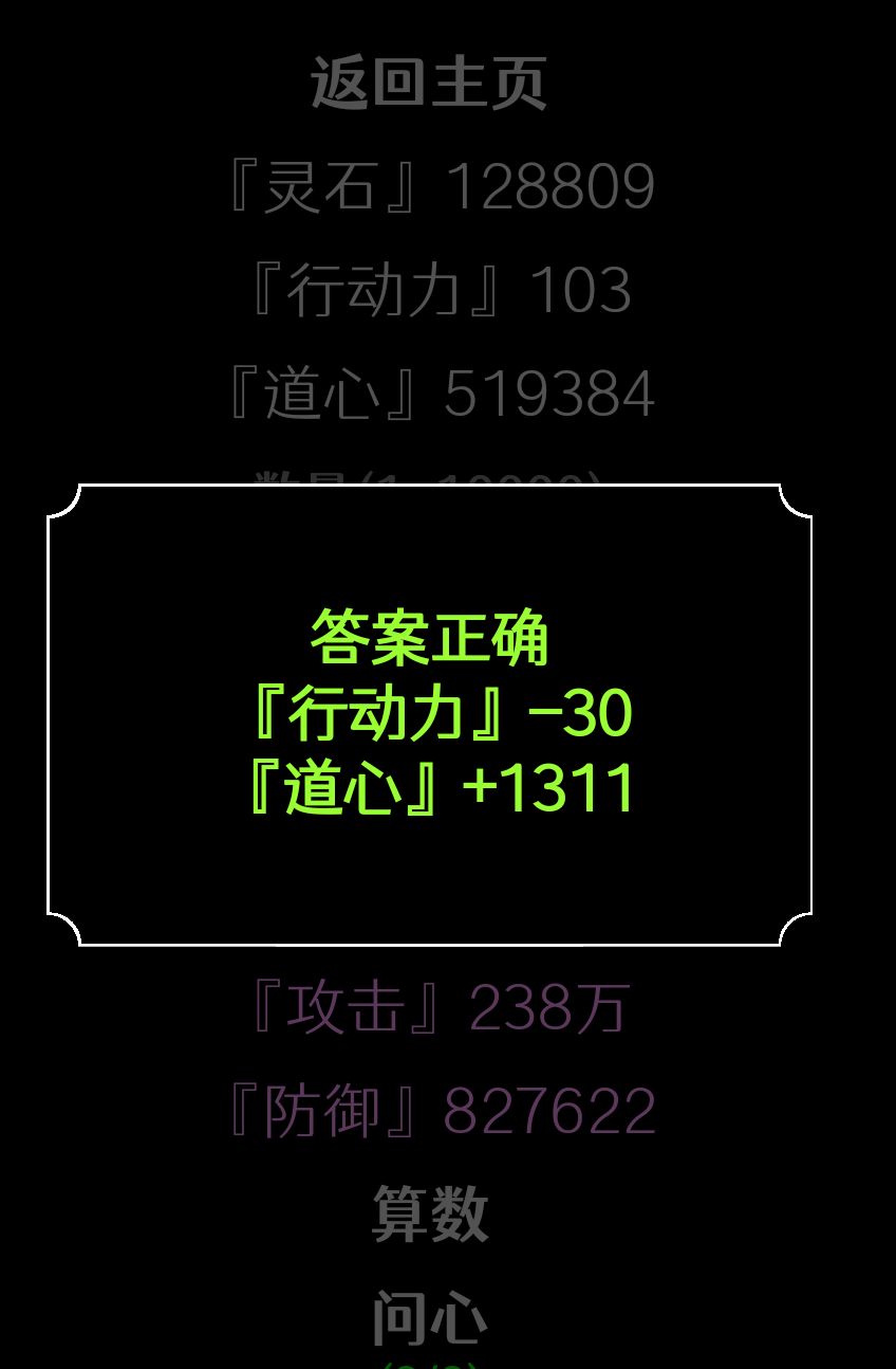 作者硬是把一个文字游戏变成了一个算数游戏。游戏从元婴开始缺灵石和道心,元神后每一个小境界需要算几百道数学三位数加法题,然后指数增长,差不多元神初期200道题,中期400道题,合体之前2千题,悟道1万题,成仙10万题。