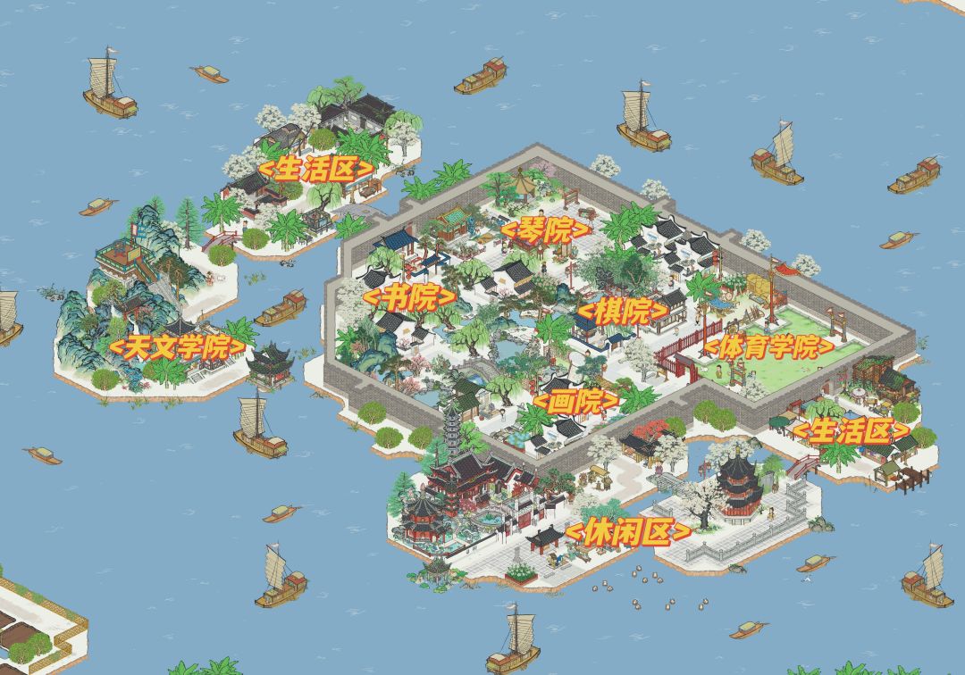 天文学院单独在一个高山林立的小岛上,方便观星,府衙和食堂靠近仓库,也有看戏和卖鞋的小店