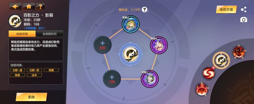 ①4技能元气具象多上攻击力高的契约石,尽量上4颗,强烈建议我这第4个孔位的高阶充能,可以保证buff时间完整覆盖全程,让场上一直有影子,其他可以参考我这里