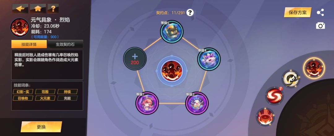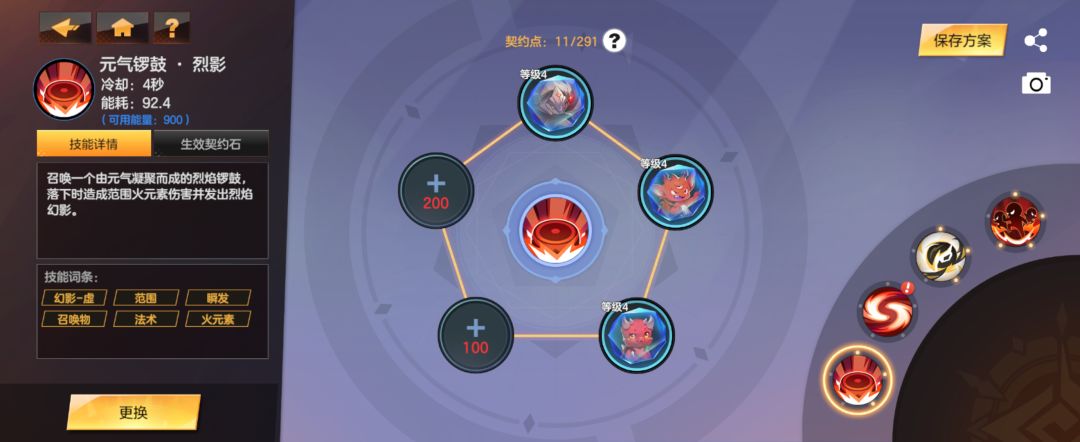 ②3技能2颗回能契约石保证能量够用,这里我1技能带的锣鼓感觉群体能力还可以,2技能装不了契约石了所以直接舍弃