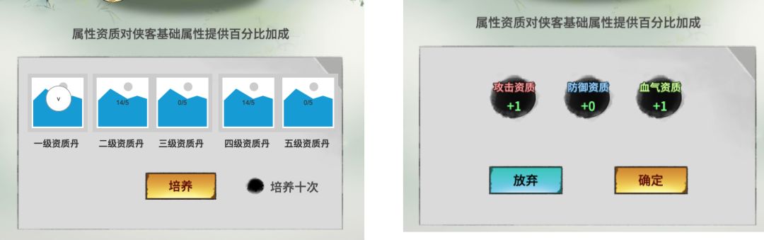 侠客资质培养,将从依次消耗不同的丹药,调整为可以自由选择使用不同的丹药进行培养(不同的丹药培养属性是否提升概率有所不同)。