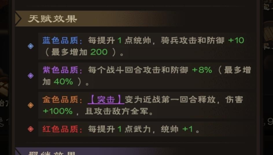 觉醒天赋中专精骑兵,把夏侯的骑兵数值拉到最大化,极致的数值怪物现在欠缺了一把发挥实力的钥匙,钥匙在于突击的高概率释放和本身金色天赋的配合,数值还能进行叠加,赋予了夏侯极致的输出手段,怪物的数值加上怪物的输出方式,诞生了这个能脚踏盖世,拳打名将的绝对t0英雄。