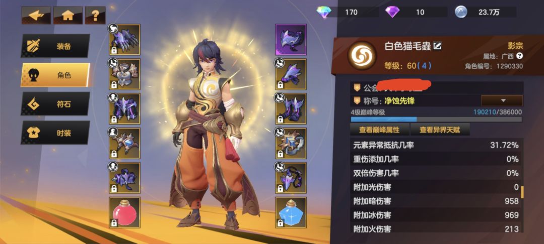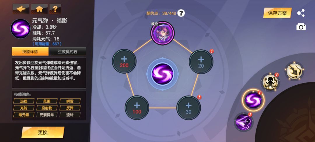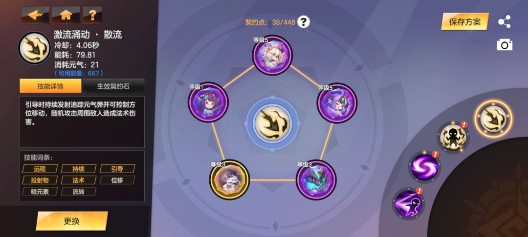 然后是技能石,涌动,狼牙,位移必备,高阶投射也是不可缺,没有先用低阶投射先用用,高级充能等7孔再用,最后是核心中的核心,必带一个高阶元素,最好是暗。