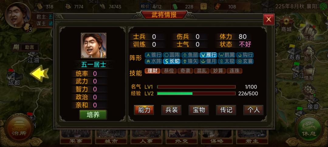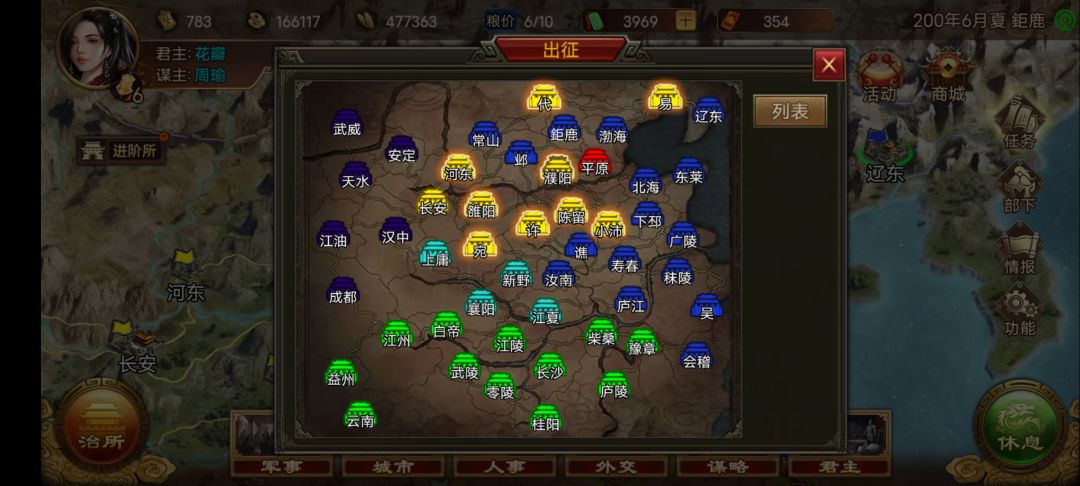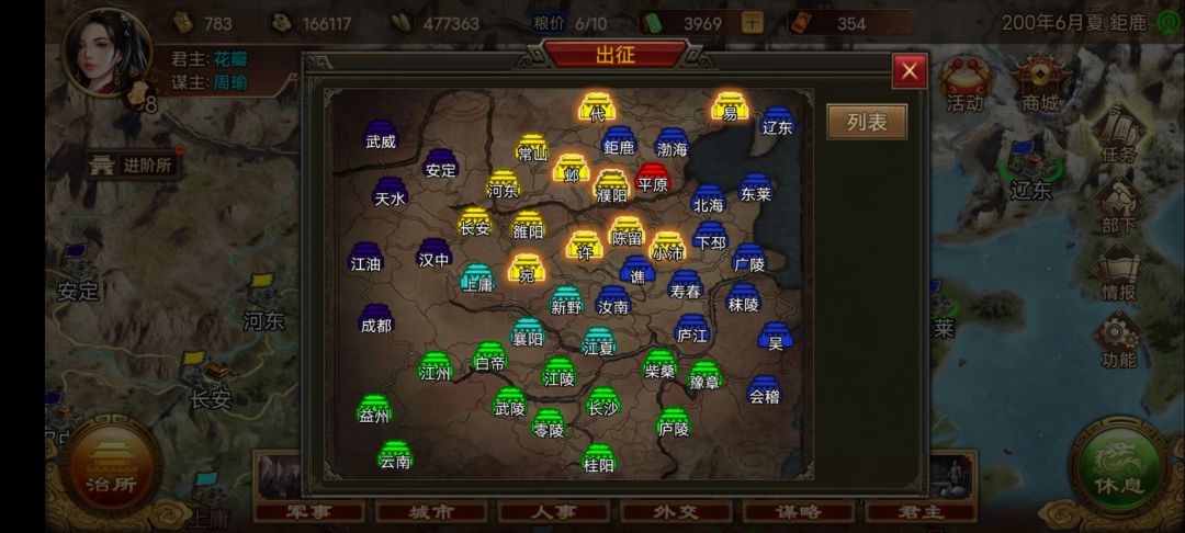 3.每个季度,或者是一定的时间(大概4个月),电脑会把手下在那个城池的位置部署,重新全部随机一遍。