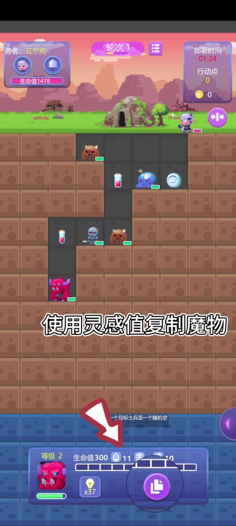 每次挖掘,合成都会获得灵感值,可以使用灵感值复制一个魔物单位来壮大你的魔物军团,最后就是进行合理的布阵啦~