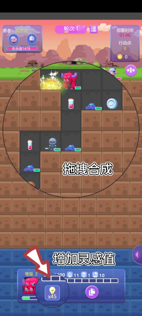 通过拖拽的方式,可以对资源进行两两合一达到更高的等级,当魔物合成到3级以上还会奖励额外的行动点。
