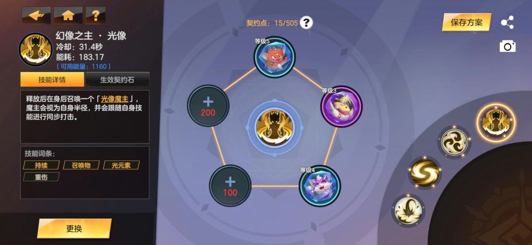 四技能【幻象之主·光像】补伤害,CD比较长,推荐带上减CD的契约石,可以带猛击、高阶破击、时间加速。