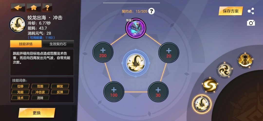 一技能选【蛟龙出海·冲击】,不是主要输出技能,契约石随便带即可。它的词条也有【反弹】,可以跟元气弹一起弹弹乐;并且自带一段位移,不管是跑图还是逃命,都非常灵活好用。