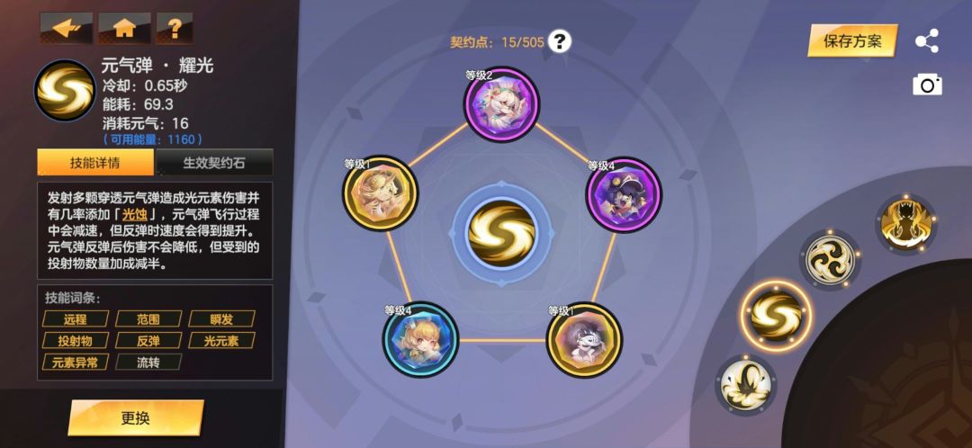 二技能【元气弹·耀光】,主要输出技能,契约石尽量堆满。可以带狼牙穿刺、迅捷投射、耗能涌动。后期契约点多了,再把锐击之类的补上。