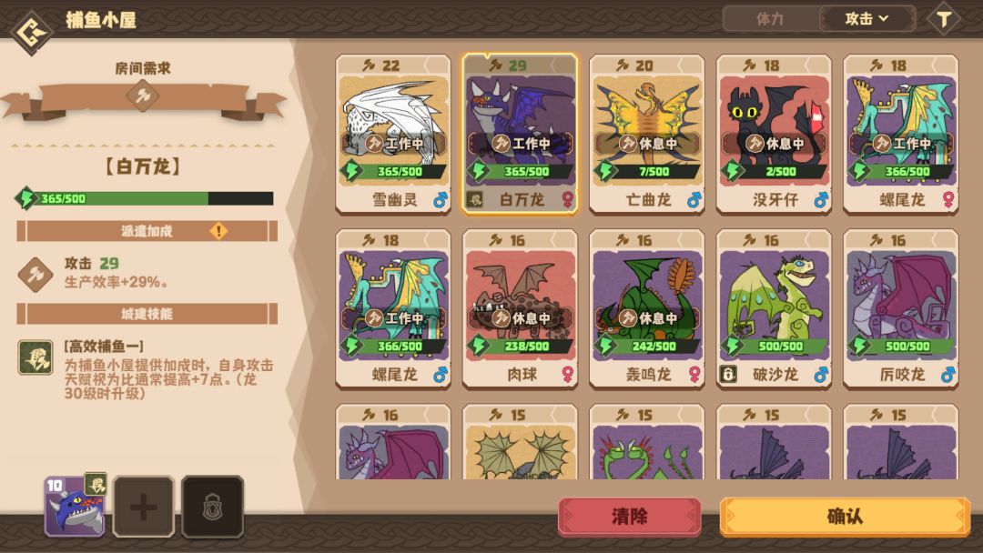 龙在建筑房间中工作可以增加生产效率。而根据房间的需求,选取属性和城建技能合适的龙进行工作,生产效率将进一步提高!属性可以后续通过训练室来提高,而城建技能可以简单的通过升级来提高。生产型建筑在等级提升后还能解锁更多龙的工作槽位,更大效率提升生产!