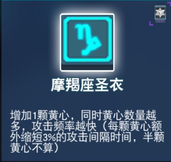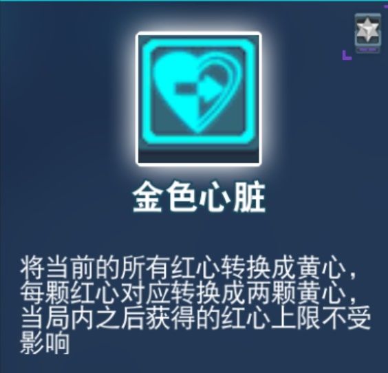 黄心流的核心之一,基本相当于有几个黄心就加几点上限,效果爆炸。有了它,保黄心的难度大大降低,还可以把红心压得很低,一般有2-3颗红心就够了,多余的可以尽情去维罗妮卡那里换东西。黄心多了可以配合摩羯座圣衣、宇宙牌香烟等。红心压低可以配合占士被动、万德弗尔被动、反应装甲等,神器,真正的神器,把名字首尾连一起就是神器啊!唯一的缺点可能就是会更不容易进试炼之地。