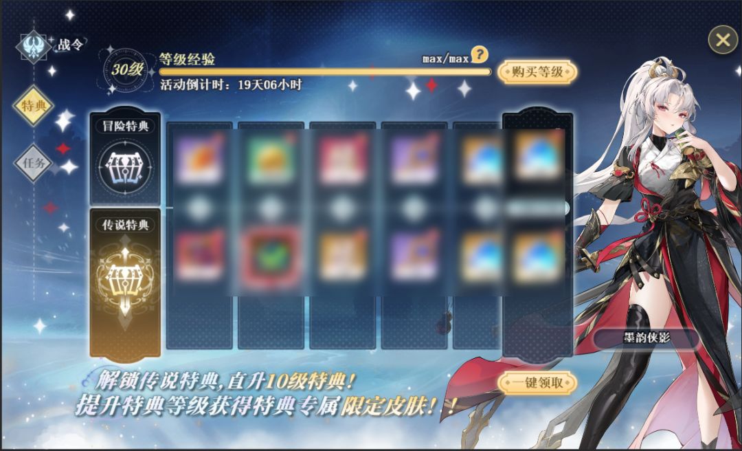 「传说特典」功能开启预告。购买传说特典,可获得嫣红魔方,首领契约书,「三叶音·墨韵侠影」皮肤等