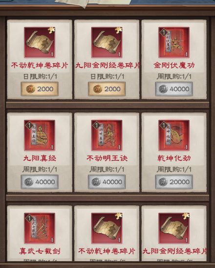 建议元宝购买,九阳金刚经可能是大部分少主的第一本神级功法,它的合成需要10级九阳真经和10级金刚不坏。而九阳真经可以帮助到日常江湖战斗+武林大会,早晚都会获取到,因此建议大家购买。