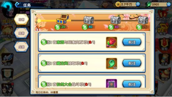 任务则分为日常、周常、成就三种类型,打开任务列表后,点击“前往”按键就可以自动接取进入任务。