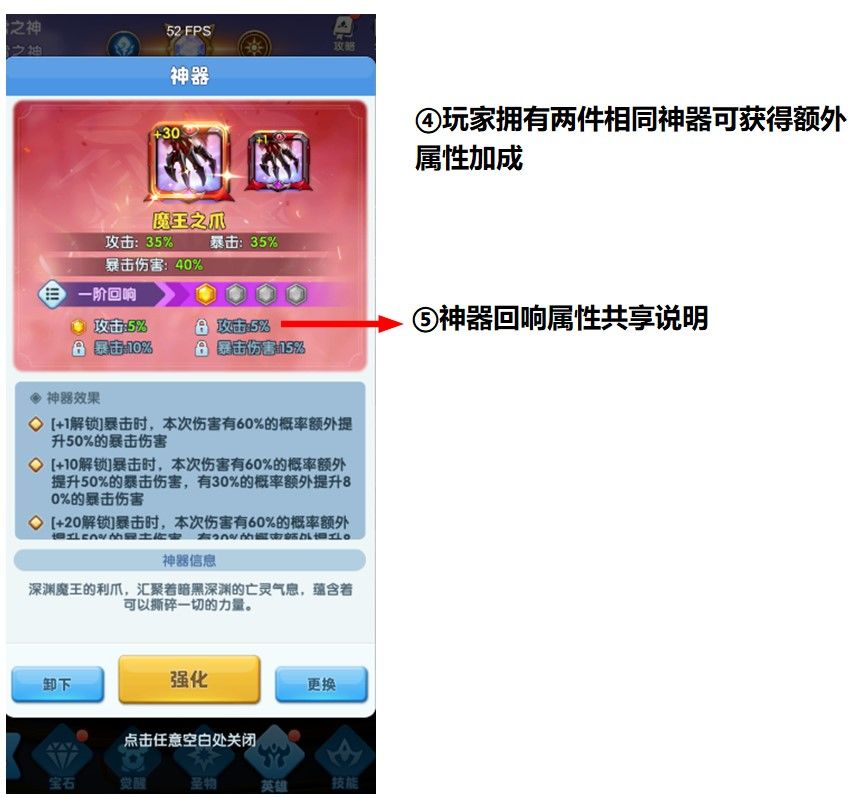 2.玩家拥有两件相同神器可获得额外属性加成,额外属性加成分为四阶,可通过强化两件相同神器解锁3.同一队伍装备两件同名神器,只有一件神器的特殊效果生效(属性加成效果保留)