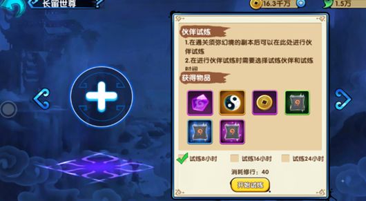 ⑥须弥幻境伙伴试炼,伙伴试炼会产出大量金币和材料,试炼分8小时,16小时,24小时,试炼时间越长金币等材料越多,所以修行值多的玩家可以选择24小时试炼时间。