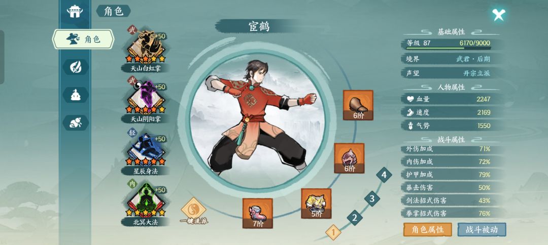 天山白虹掌(至少7星): 暮云闭合必须两星,被动大成(一定不能升圆满),重点改良全满