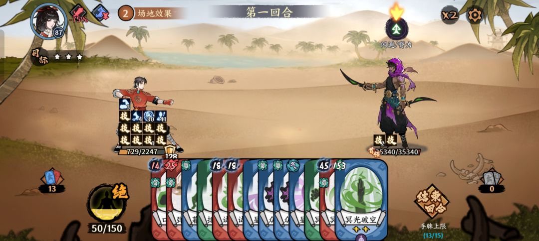 开局被打,先用两张绿色,优先使用无留牌效果的过牌和非过牌,攒够内力前不使用星灭光离,攒够后使用蓄力决再用众星捧月,然后可以使用星灭光离。第一回合主要是过牌加暗伤,手牌留好禁疗,外伤减免,冥界幻影和暮云闭合。