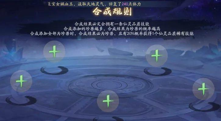 多余不用的5星幻灵可通过幻灵合成获得新的5星幻灵,合成添加的珍兽越多,合成结果的珍兽概率越高。5个全部为珍兽的话,合成结果必定为珍兽,另有20%概率带有一个仙灵品质的稀有技能。