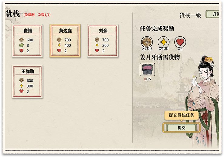 PS:请谨慎升级二级货栈,会出现当前等级比较难完成的任务(但获得的奖励也更多)。