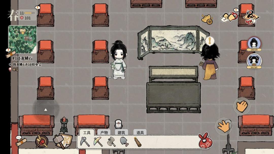 ④ 百宝阁:在NPC刘余所在的建筑,会需要收集“珍宝”,珍宝可以增加美观度,及触发刘余相关事件(可能?)。