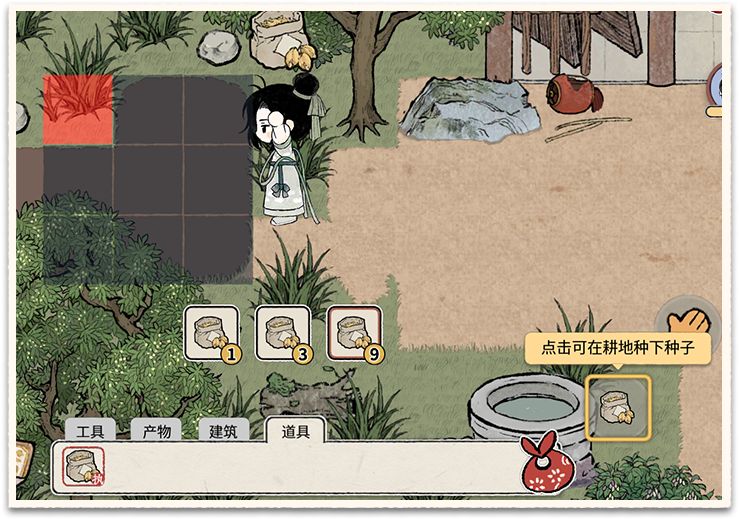 ① 耕地种田:选择耕地长按可以最多一次耕9块地,播撒种子也可以一次9个种子。