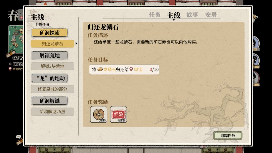 ① 主线任务:指的是由“你”寻回过去和安居现在的故事,完成这些故事获得对应的奖励。