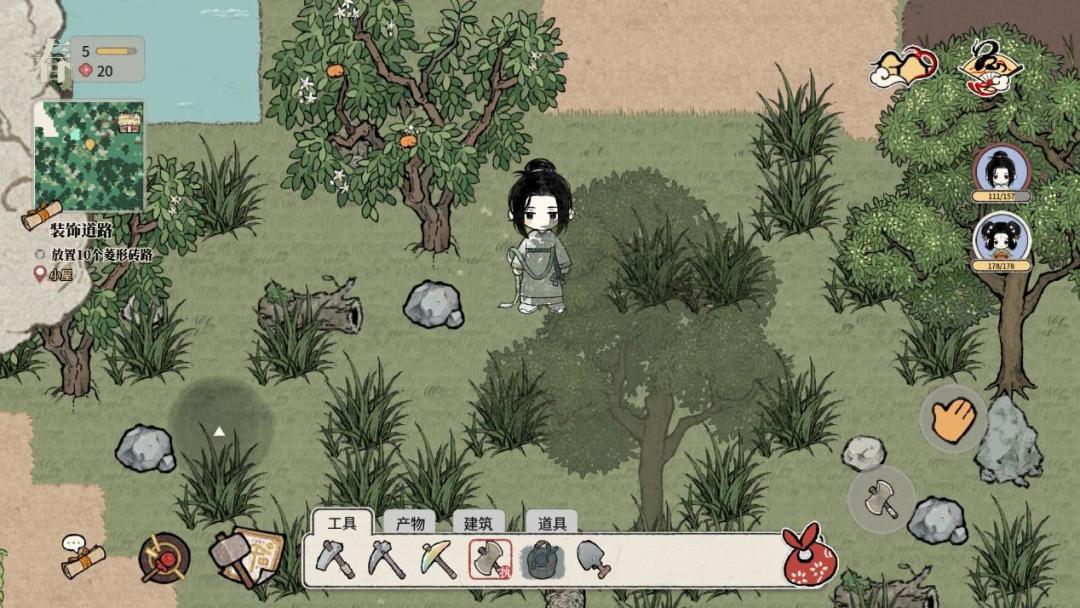 - 《十洲繁华景》的游戏操作类似于传统家用机掌机上的种田类游戏(动物森友会、牧场物语类),主要使用摇杆、按键来交互操作,点击屏幕移动作为辅助操作。