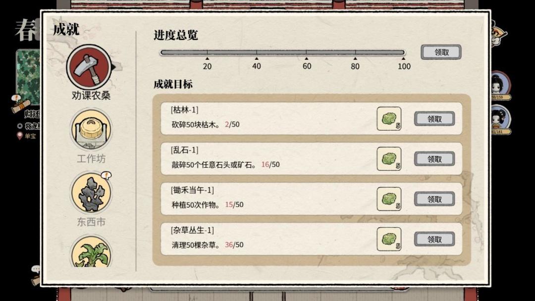 ② 成就:劝课农桑、工作坊、东西市、贸易探索、欢聚一堂等类,覆盖种田养成、营造合成、区域解锁地图功能、角色养成攻略、社交贸易等功能的收集。