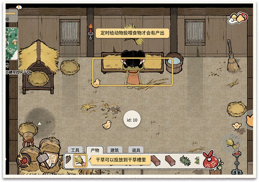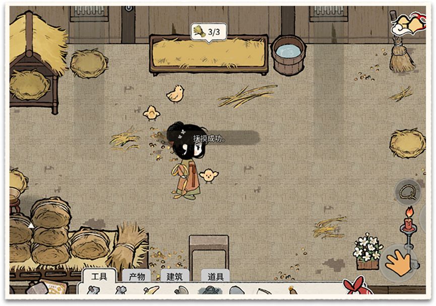 1-3 禽舍抚摸:抚摸禽舍和畜圈的动物,可以提高动物的好感度,获得的高阶产物的几率也会提升。