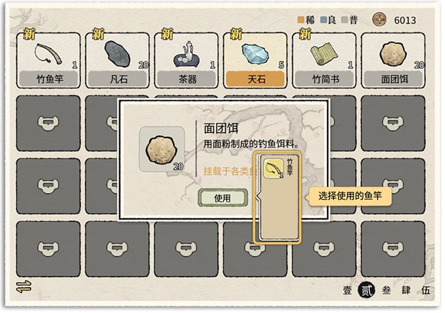 ① 饵料/诱饵:将饵料或诱饵装配到对应的鱼竿蟹笼、陷阱等道具上,再找到合适的地方放置就可以得到不同的产物。