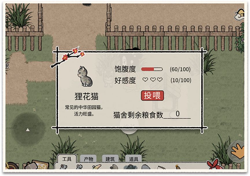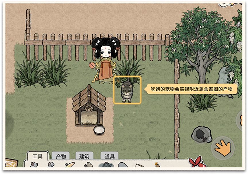① 宠物:到达14级可以建造猫屋饲料猫狗宠物,动物们会放置禽舍畜圈的产物被野兽叼走偷盗呢。
