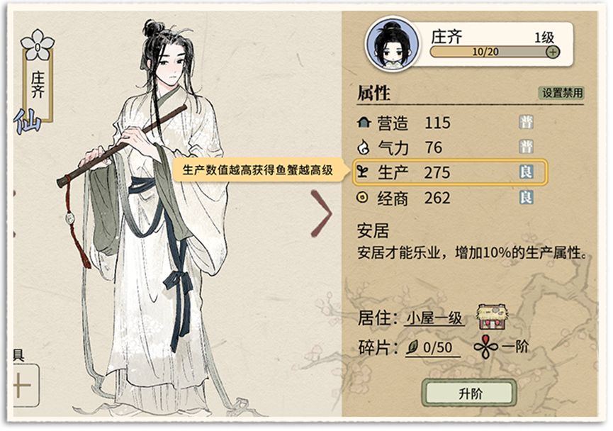 3 生产:生产的数值关乎种植、鱼蟹陷阱等品质高低,也可以加快作坊、食物、工作台用具的生产对应素材的时间。