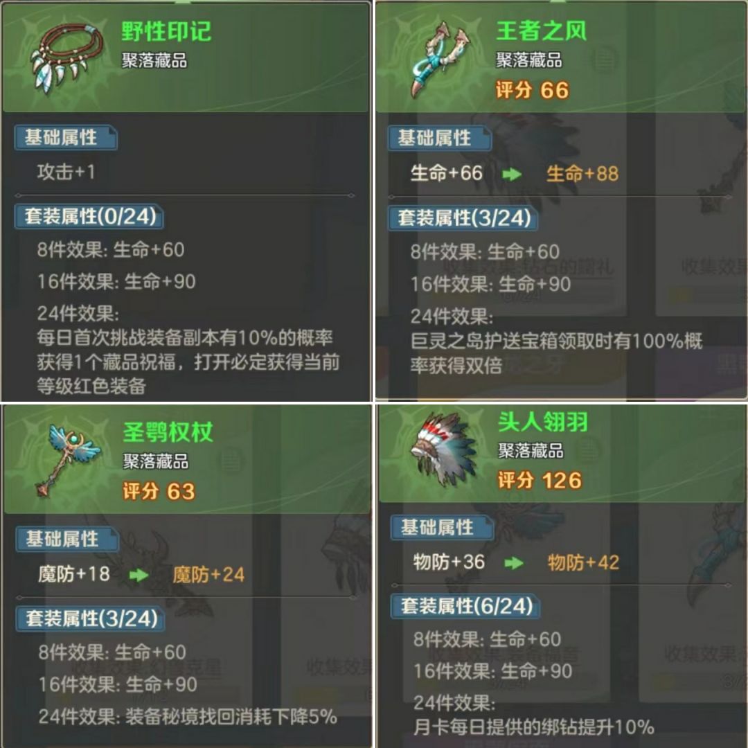 2.【头人翎羽】★★(收藏上限24件)基础属性:每收藏1件获得:物防+6 。套装属性:8件效果: 生命+60;16件效果: 生命+90;24件效果:【钻石的赠礼】月卡每日提供的绑钻提升10%。