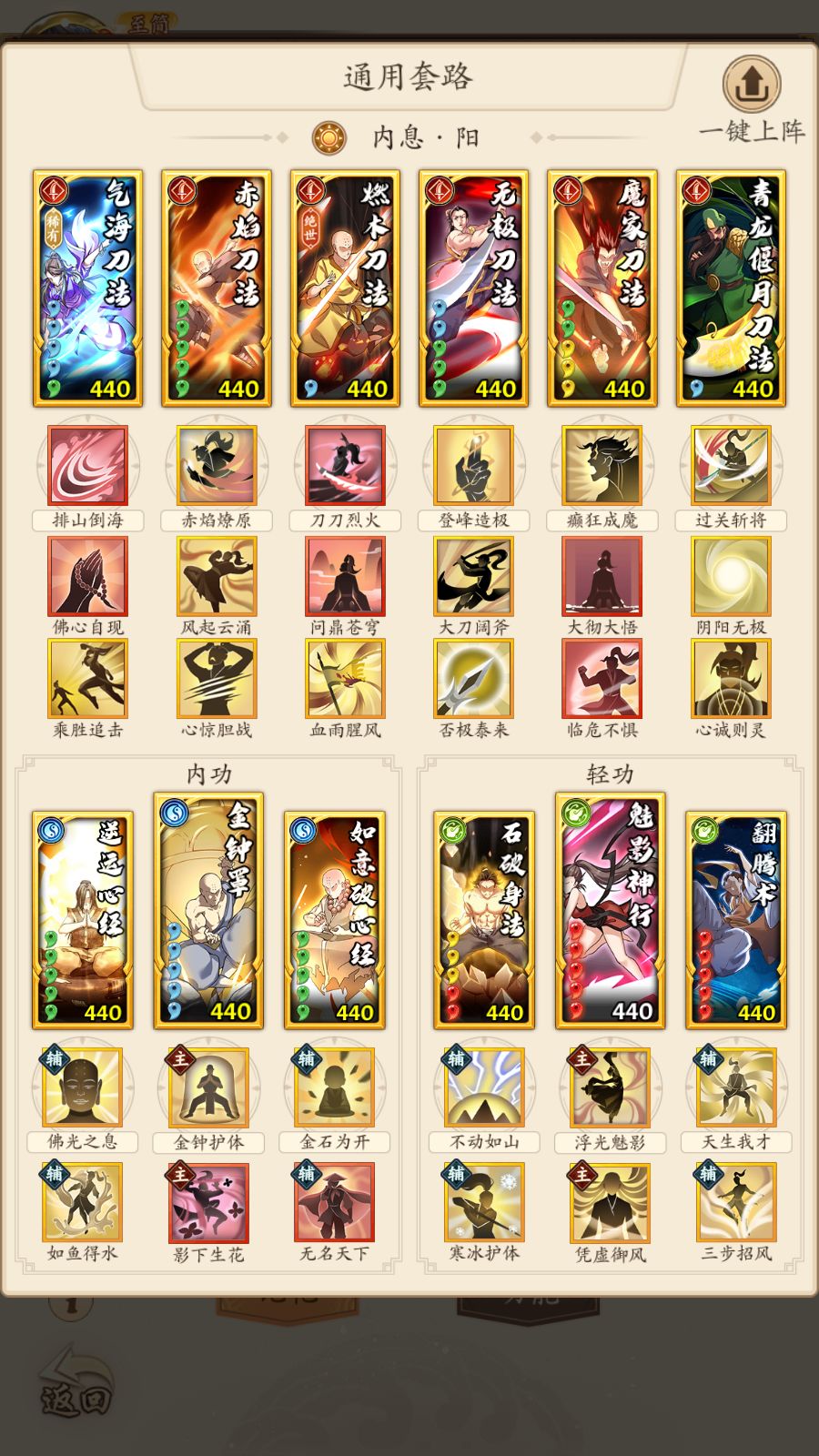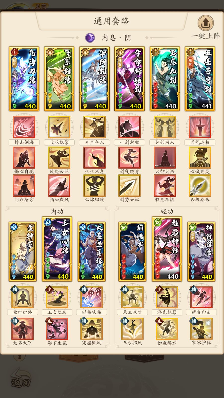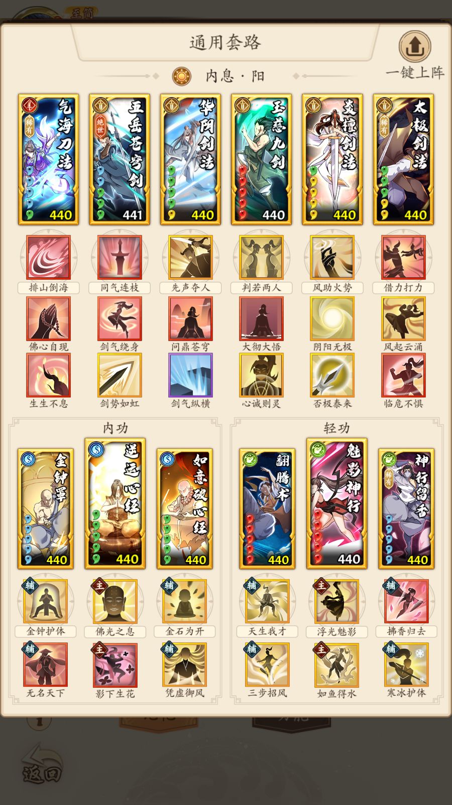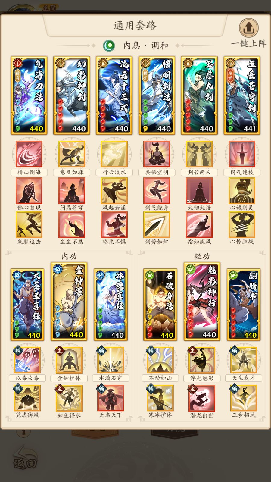 第三篇:调和剑。还是用的魅影主运,考虑了先觉,但前期来讲。还是魅影好一点。后期其实主运清风步也很不错,其中道理就不细说了。没有指如疾风的,就把心惊胆战放那里,五岳带个否极泰来。如果没有潜龙,就主运凭虚御风。