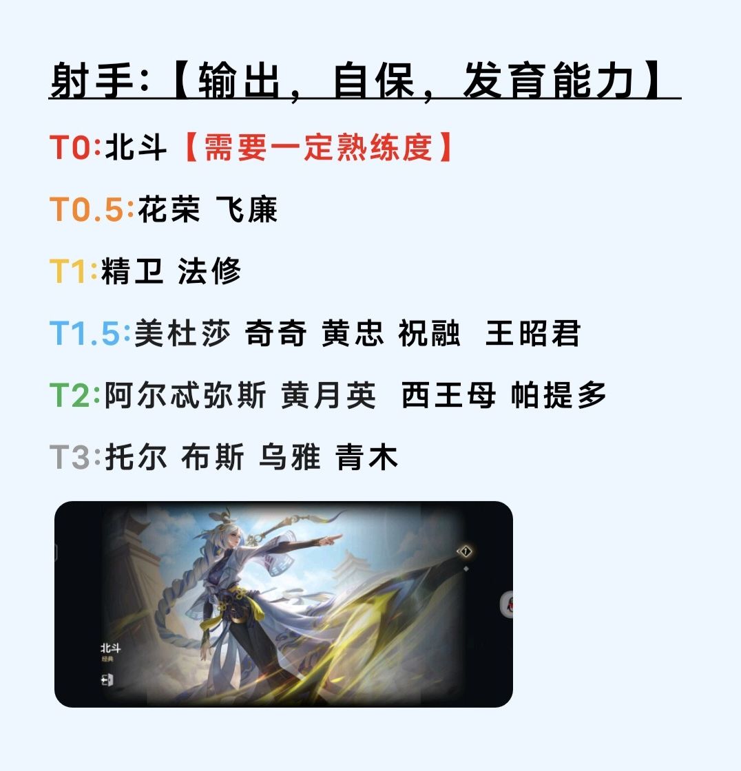 射手一姐北斗,凭借着强开团,多控制,高回复,高伤害稳坐幻神位置!花荣作为站桩射手特别吃经济,所以发育第一位,后期大哥,飞廉的高机动性和一定的爆发,让他在各个时期的团战都游刃有余,是十分不错的射手,精卫主打的就是大招起手控人秒人【新赛季加强了哦】,法修只要有输出空间,加上自身两个保命技能,也是后期输出战神