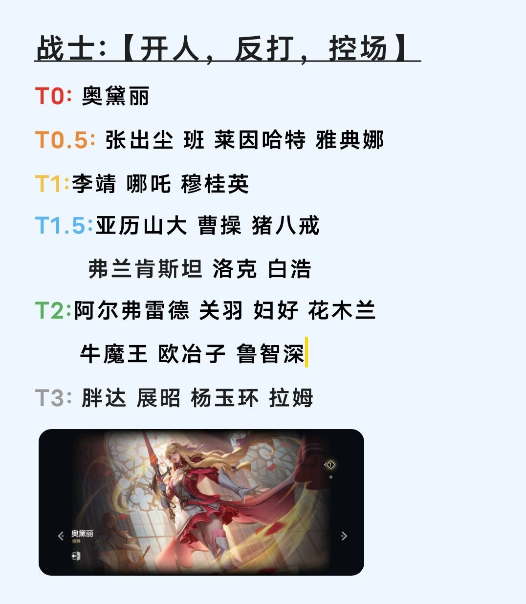 奥黛丽出色的反打,开人能力,让他成为了战士一姐【当然走打野位可以让奥黛丽有更多发挥空间】,先手能力数一数二,伤害不俗,二技能回复和控制能力,让他在反打时有更多操作机会,二梯队的四位英雄都有很强的粘人站场能力,可以作为团队里面的开团位和牵制位