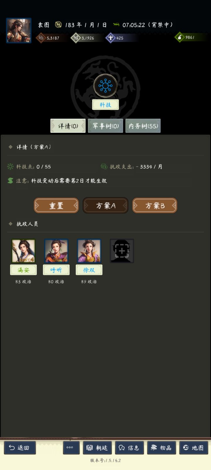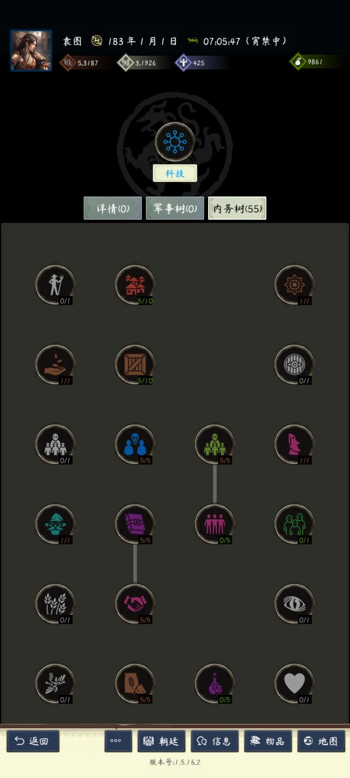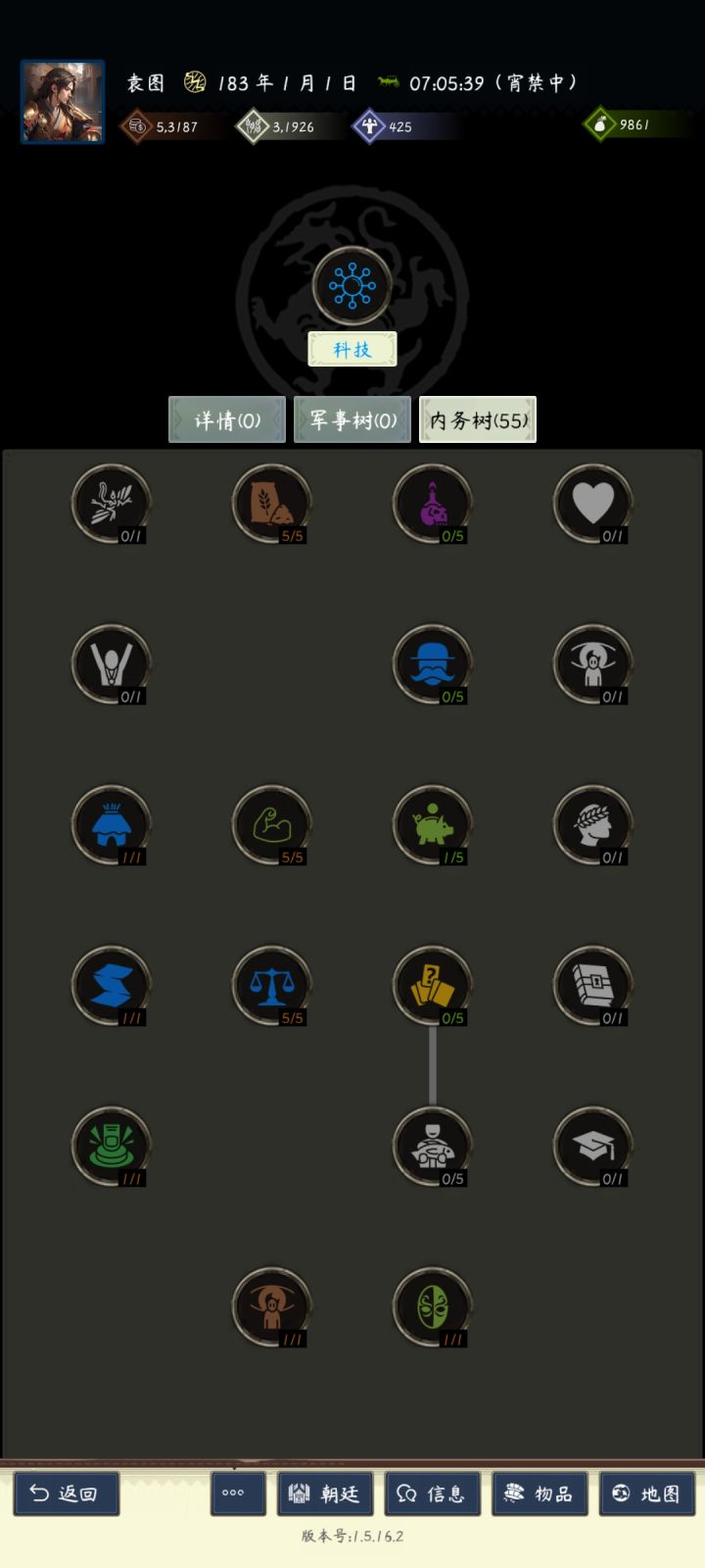 当你能打五级地了,这个时候可以考虑上三个80政治以上的将领进入内政点科技了前期必备的(征税,富豪,名声,众望)尽量在野地里招到相关内政将特别是征税和富豪,不管是什么战法特性先拿再说,能贪就贪。备两套科技点,军事树一般在打架才开,打地也不建议开。
